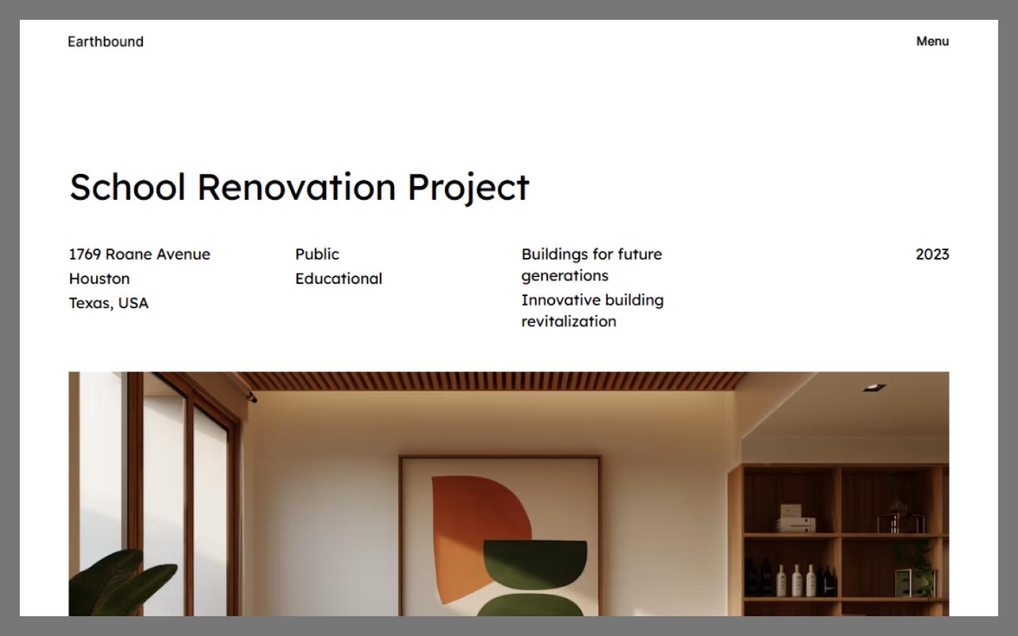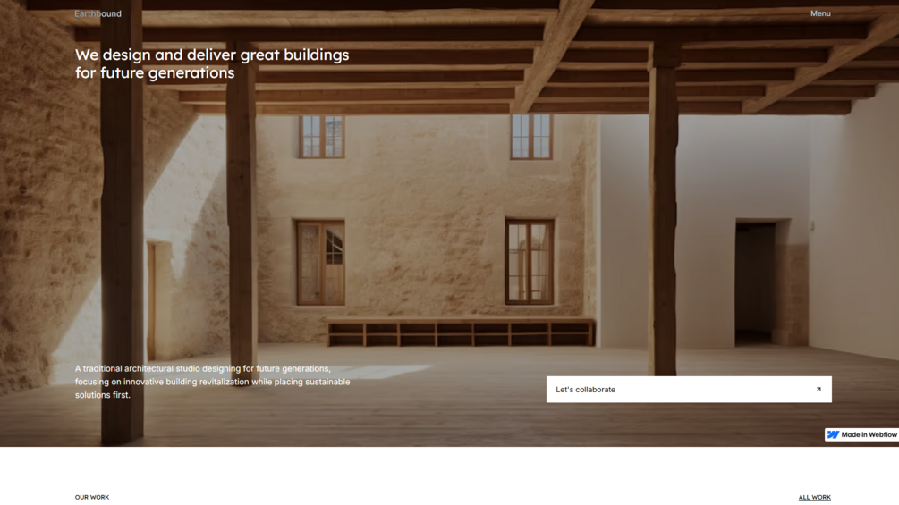 Earthbound is a minimal and modern architecture studio Webflow template. Use this template to showcase your architectural projects in a stylish grid view or a list. The template also includes collections for disciplines, colleagues, awards and categories for your portfolio.