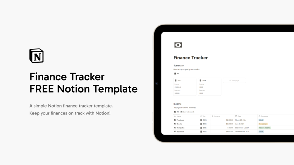 A simple Notion finance tracker template. Keep your finances on track with Notion!